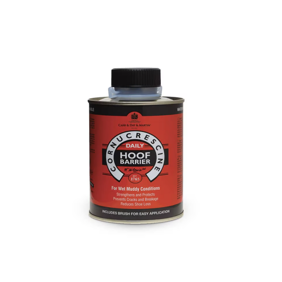 Cornucrescine Daily Hoof Barrier forms a breathable, water-repellent shield that protects the hoof from excess moisture, bacteria, and environmental damage. It’s ideal for daily use as it helps maintain strong, healthy hooves and reduces the risk of issues like thrush and softening feet in wet conditions.
