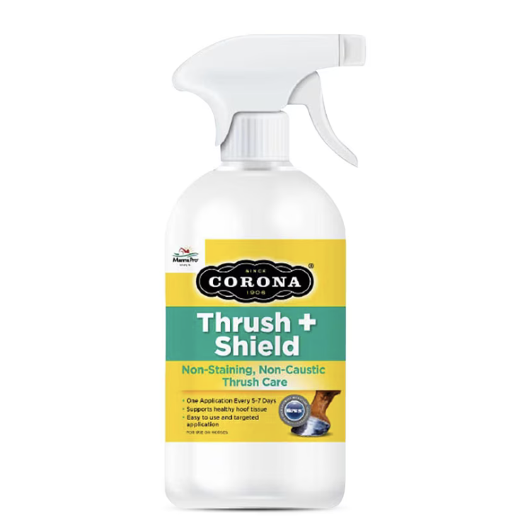 Corona Thrush and Shield Spray is designed to treat thrush by targeting the bacteria and fungi that cause it while helping dry and toughen the affected areas. The spray is easy to apply deep into the frog and other crevices. It also leaves behind a protective shield that supports healing and helps prevent thrush from returning. Plus, no staining!